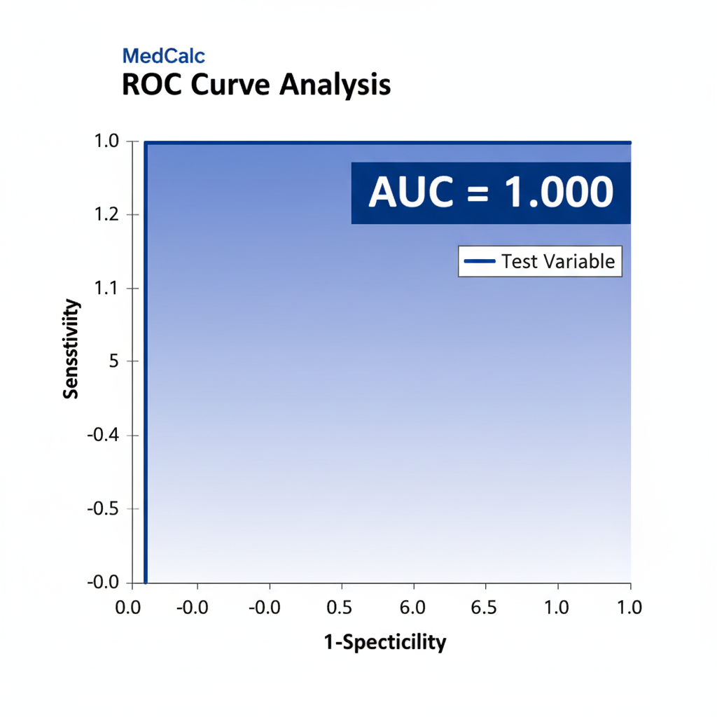 | ROC AUC | 1.000 (0.832–1.000) | Perfect discrimination capacity. |