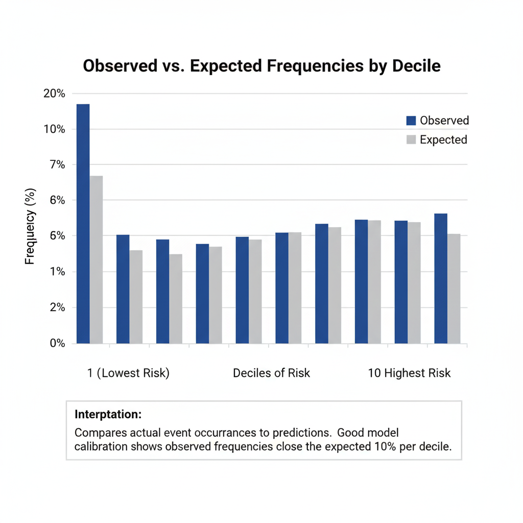 Predicted and observed frequencies match perfectly across all deciles, confirming that the model classifies each case correctly—a rare event in real-world data, again suggesting overfitting or separation.
