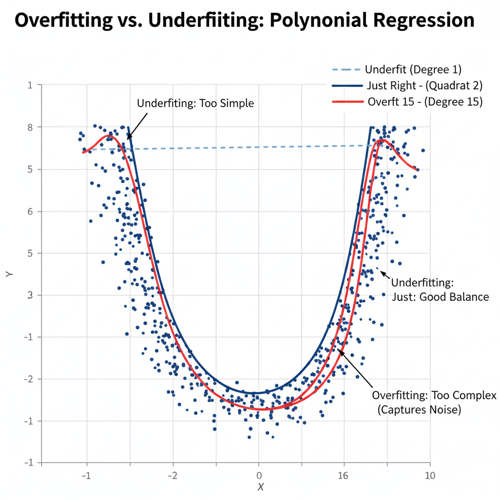 While a second-degree polynomial (quadratic) is generally safe, higher-degree models can overfit, meaning they capture noise instead of genuine patterns. Overfitting results in poor generalization to new data.
