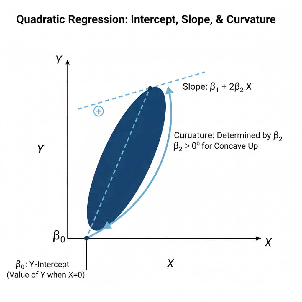 - β2 (Quadratic term): Determines the curvature — whether the parabola opens upward (β2>0) or downward (β2<0).
