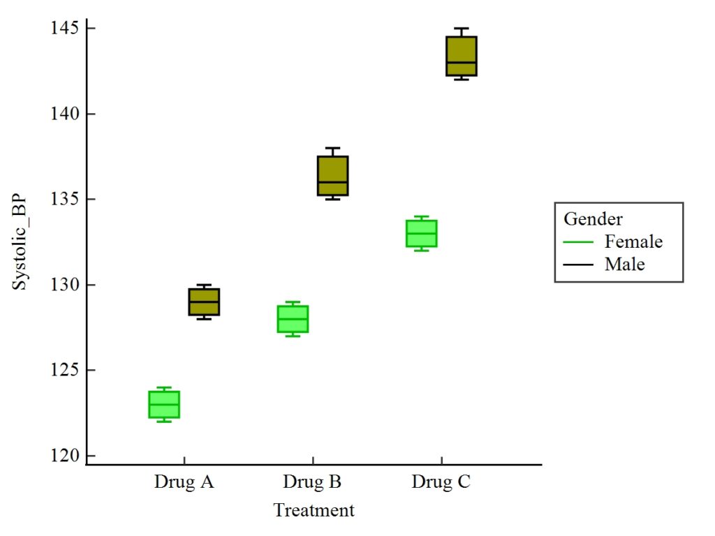 This interaction is clearly visible in the box plot, where male BP values increase more steeply across treatments than female values.