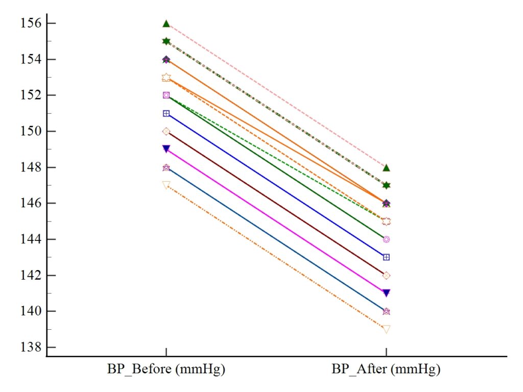 In this analysis, systolic blood pressure measured before and after treatment showed a statistically significant reduction, supported by numerical results and visual evidence from the dot-and-line chart. This confirms the effectiveness of the intervention and demonstrates the practical value of the Wilcoxon signed-rank test in medical and biostatistical research.